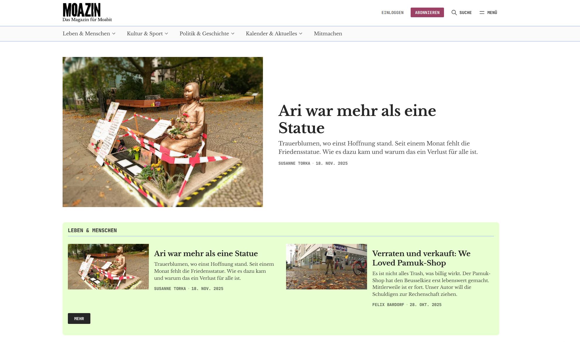„Eine Art Grundfinanzierung“ durch das Städtebauförderprogramm „Sozialer Zusammenhalt” des Bundeswirtschaftsministeriums ermöglichte, dass das neue Magazin für Moabit überhaupt starten konnte. Mit 56.000 Euro aus dem Leitprogramm der sozialen Integration, das unter anderem das Ziel verfolgt, die Einbindung aller Bevölkerungsgruppen zu unterstützen und den Zusammenhalt in der Nachbarschaft zu stärken, wurden vor allem der Aufbau der Online-Plattform und die ersten Redaktionssitzungen auf die Beine gestellt. „Mittelfristig suchen wir nach ergänzenden Förderungen, um unser Medium aufzubauen“, verspricht Ruf, langfristig biete die Plattform die Möglichkeit der Finanzierung über Spenden, Abonnements, aber auch Sponsoring. „Um attraktiv zu sein probieren wir daher viel aus, zum Beispiel einen KI-gestützten Veranstaltungskalender.“
